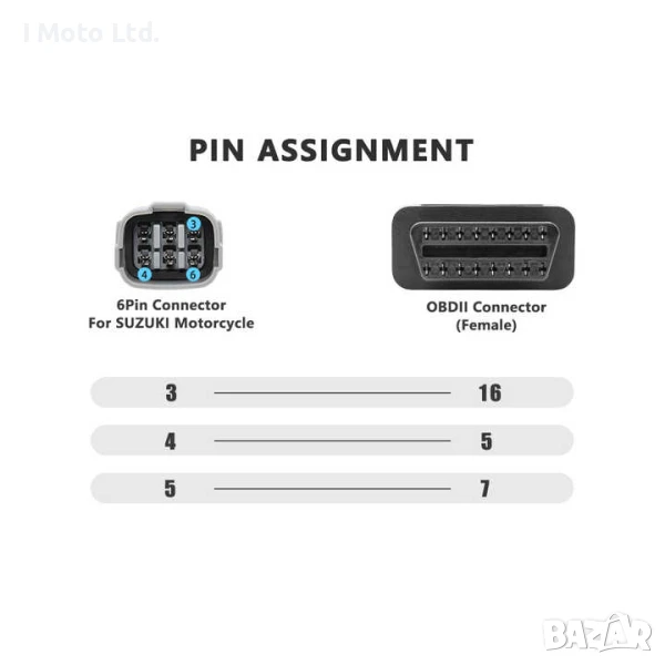 Този 6PIN към OBD2 кабел е предназначен за свързване на мотоциклети Suzuki със съвместими диагностични инструменти чрез стандартен 16PIN OBD2 интерфейс.