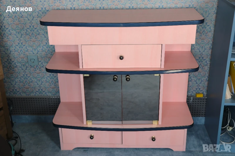 Размерите са: дължина 100 см, височина 95 см, дълбочина 40 см. Шкафът е правен по поръчка, и е на повече от 25г. , но е много запазен, дълго време въобще не е бил ползван. Ще издържи още няколко пъти по толкова, понеже през 90-те плоскостите бяха плътни и тежки, за разлика от сегашните рехави. Точно такова розово след 90-те така и не се появи на пазара. Проектиран беше за съхранение на дискове и плочи. Плочите - в страничните ниши, а дискове и касети - под горният капак.