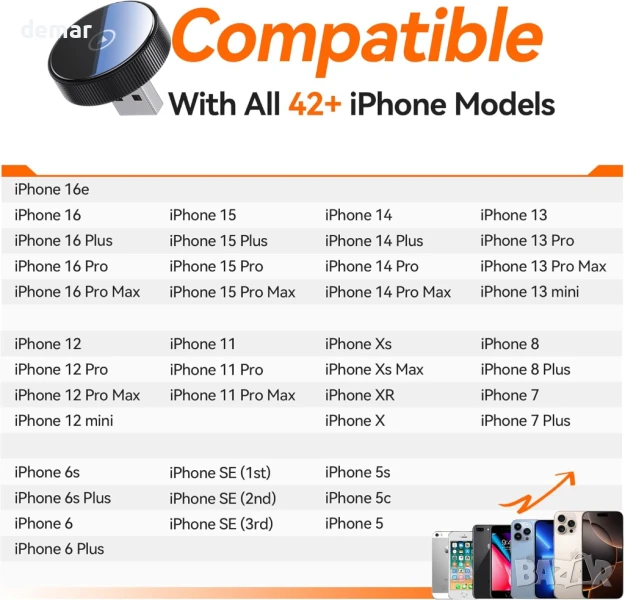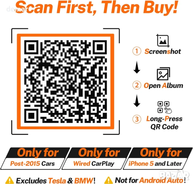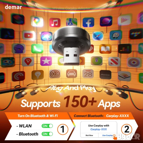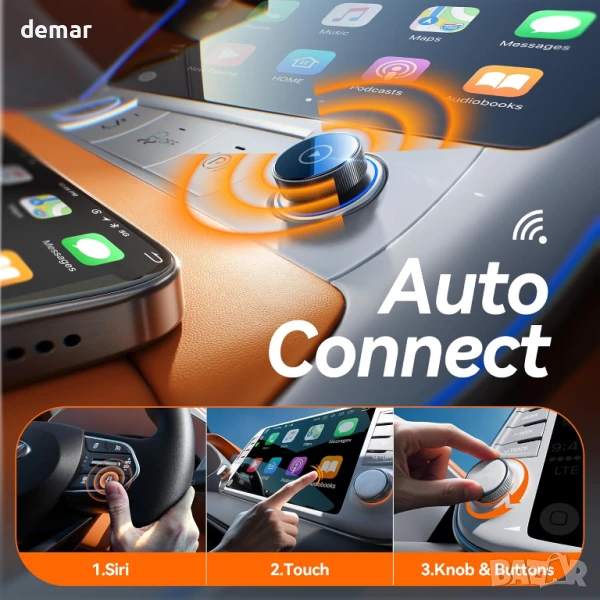 Този мини безжичен CarPlay адаптер предлага дискретен, ултратънък дизайн, който се вписва плътно в USB порта, като по този начин предпазва купето от безпорядък, като същевременно позволява пълноценно безжично CarPlay за музика, навигация, разговори и Siri. Сдвоява се веднъж и се свързва автоматично мигновено при стартиране, захранван от Bluetooth 5.3 и двубандов Wi-Fi 6 за бърза и стабилна работа без забавяне или прекъсвания. Адаптерът поддържа над 900 модела автомобили (с изключение на Tesla/BMW) и iPhone с iOS 10+, като настройката се извършва за секунди. Той осигурява безупречно качество на звука и картината, ултраниска консумация на енергия за защита на батерията и съвместимост с USB-A/C за по-широка употреба. Поддържайки над 150 приложения с гласово, бутонно или копче за управление, той осигурява безопасно и удобно шофиране.