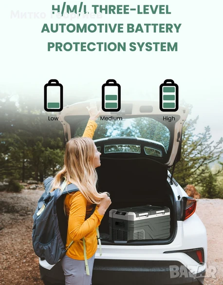За да се гарантира безопасността на батерията на вашия автомобил, този къмпинг хладилник предлага три нива на защита на напрежението на батерията (H/M/L), за да се предотврати изтощаването на батерията на вашия автомобил. Когато открие ниско напрежение на батерията на вашия автомобил, той автоматично ще спре да работи. Освен това, хладилникът за кемпери поддържа две опции за захранване, 100/240V AC или 12V/24V DC, осигурявайки гъвкавост за използване навсякъде. 45dB нисък шум и защита от разклащане: