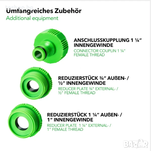 Съвместим с: Съвместим с: водоизточници Kärcher и Gardena, пръскачки за тревни площи, водоструйки, идеални за поливане на градината, почистване на колата или прозорците и други.