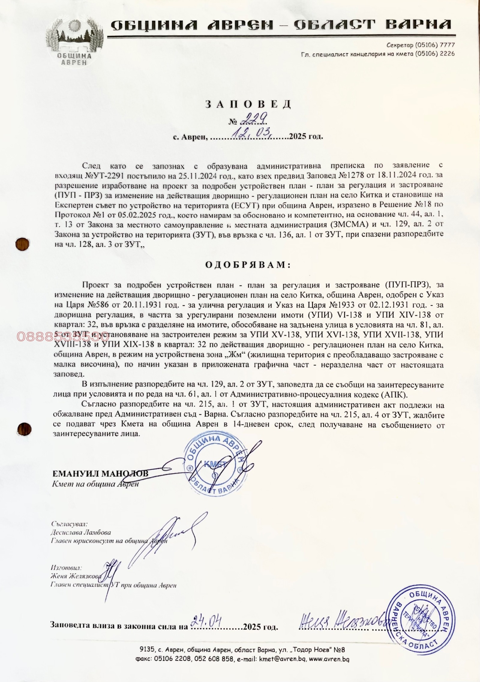 С влязъл в сила ПУП и ПРЗ, с издадени и съгласувани визи за проектиране на жилищни сгради и становища за присъединяване към Електропреносна и ВиК мрежи.