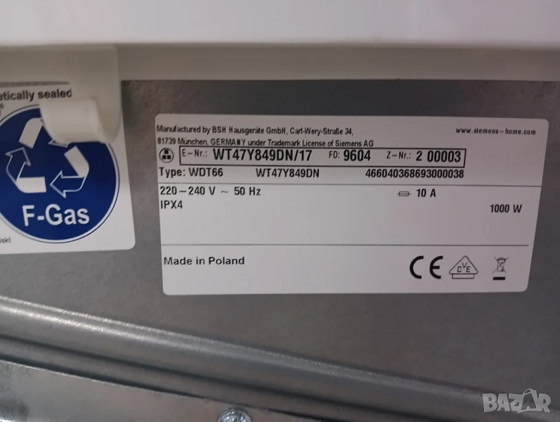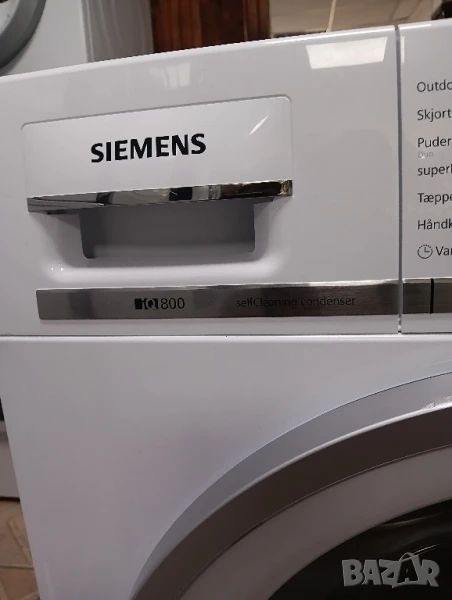 Чудесна сушилна с термопомпа Сименс, най високият клас с лед дисплей, отложен старт, изцяло тъчскрийн управление на бутоните, инверторен мотор, инверторен компресор, функция гладене при която дрехите излизат от сушилнята без гънки, самопомощ се кондензатор за улеснение на домакина и др.
