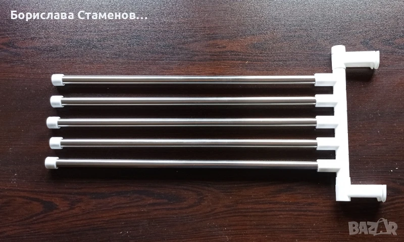 Няма кутия. Много стабилни пръчки за закачване на кърпите. Всяка се върти на 180 градуса.