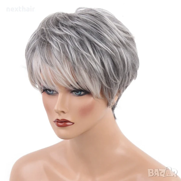 Къса дамска омбре сива перука с бели краища → Обява 51401343
