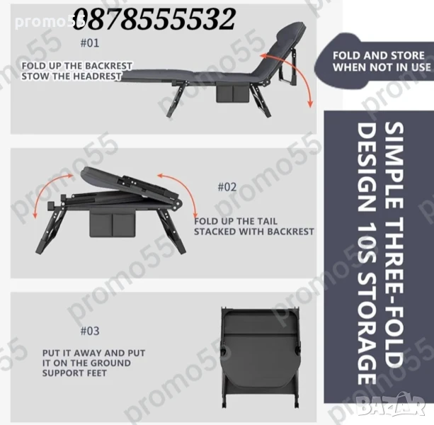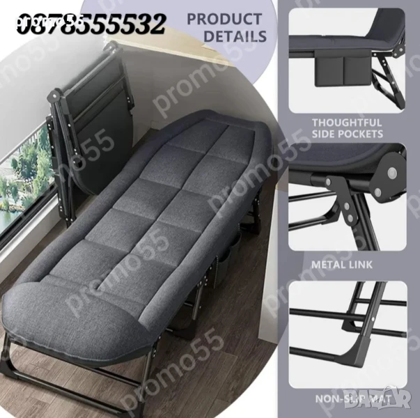Сгъваемо, регулеруемо легло с пет позиции, шезлонг с ергономичен подвижен матрак, 1 страничен джоб за мобилен телефон, книга или чаша, това улеснява вземането на вещи по всяко време, размери - 180х60х35см., съчетава функциите на легнал, спане и седене в едно!