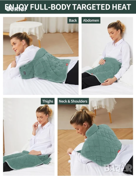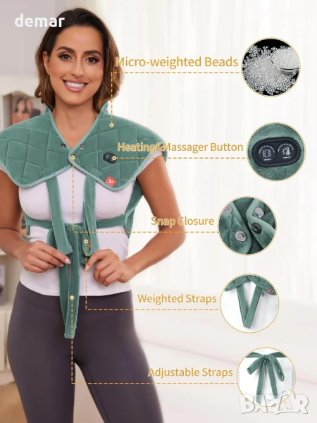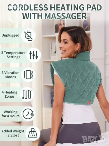 Тази преносима нагревателна подложка е с акумулаторна батерия с до 4 часа работа, 3 регулируеми нива на топлина и 3 режима на вибрация за успокояващо облекчение навсякъде, без да е необходимо да сте свързани към контакт. Загрява се само за 5 секунди и покрива 4 зони на нагряване, включително врата, раменете и гръбначния стълб, като същевременно е универсална за употреба на гърба, талията, краката или корема. Утежненият дизайн от 2 фунта с микростъклени мъниста, копчета и каишки осигурява плътно прилягане. Интелигентните настройки за безопасност включват автоматично регулиране на средна температура след 5 минути за комфорт и защита. Размери: 33,2 x 25,8 x 10,1 см; 1,14 кг