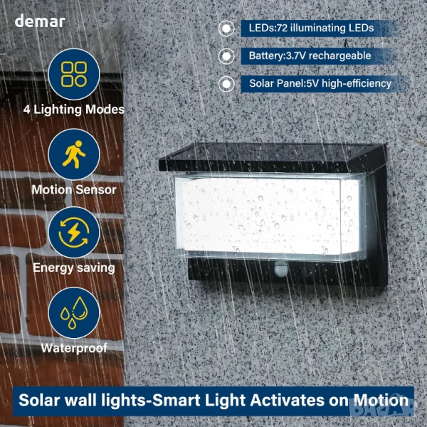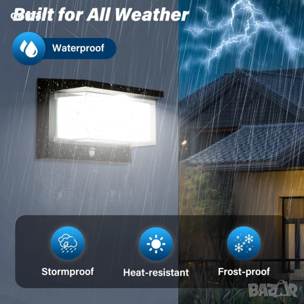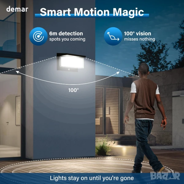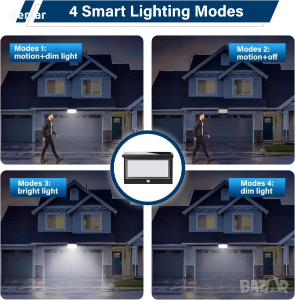 Тази слънчева лампа за външно ползване предлага четири регулируеми режима, включително активиране с движение, нежно разпознаване, целодневна атмосфера и енергоспестяващо осветление, което я прави универсална за различни нужди. Изработена с водоустойчив дизайн IP65, тя издържа на силен дъжд, сняг и екстремни горещини, като същевременно продължава да се зарежда ефективно дори в облачни дни. Високочувствителният PIR сензор открива движение до 6 метра с широко покритие, като незабавно увеличава яркостта за сигурност. Захранвана изцяло от слънчева енергия, тя се зарежда за 6–9 часа слънчева светлина и работи автоматично от здрач до зори без разходи за електричество. Инсталацията е бърза и лесна с триетапна настройка без окабеляване.
