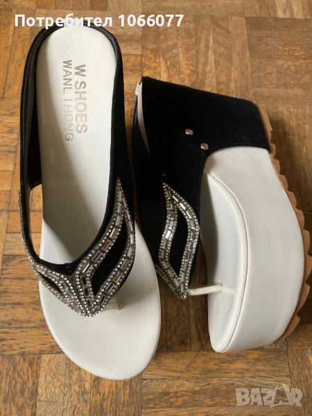 Уникални дамски чехли на марката W Shoes са изработени от черен набук и бял лак. Добавени са камъчета за по-елегантен вид. Обувани веднъж за повод.