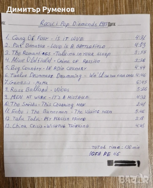 Шпула и кутия Basf, лента като нова AGFA PE 46 Double Play.Записи рок и поп от 82-83 година колекция отлични. Скорост 19см/сек (4ри писти) (стерео). Време за прослушване 130мин.