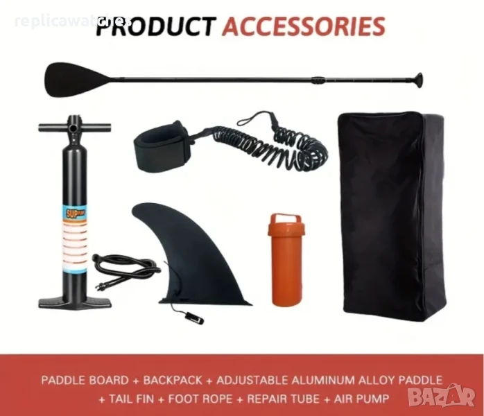 Падъл борд размерите ги има на снимките, както и аксесоарите които вървят към него, пълен комплект