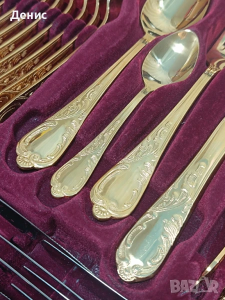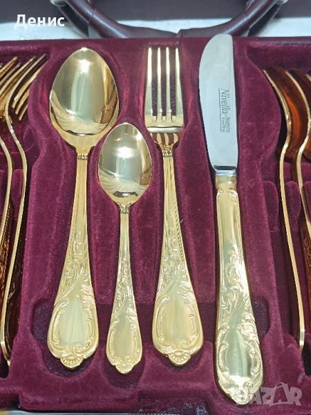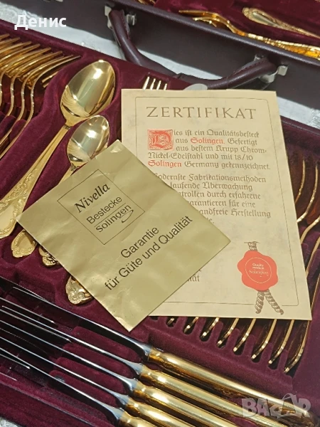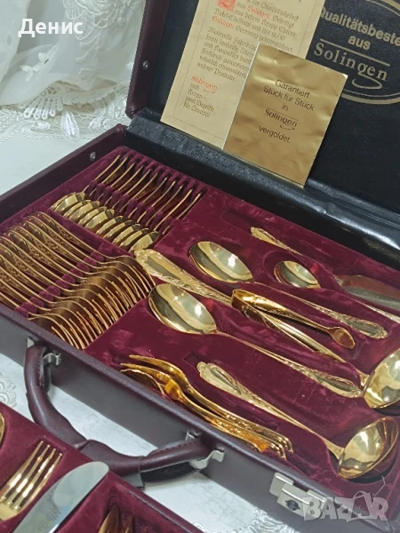 Solingen Nivella – 70 части, 24k твърда позлата. Предлагам изключителен комплект прибори за хранене Solingen Nivella, произведен в Германия – в град Золинген, познат по цял свят като „градът на остриетата“. Това е място, където векове наред се създават едни от най-качествените ножове и прибори в света, а марката Nivella е символ на прецизна изработка и луксозен стил. 🔹 Качество и материали. Комплектът е изработен от висококачествена неръждаема стомана 18/10 (Rostfrei), върху която е нанесена твърда 23/24-каратова позлата. Това не е декоративна, а трайна позлата, устойчива на употреба и запазваща своя блясък дълги години. 🔹 Състав на комплекта Общият брой е 70 части за 12 души, включително: 🌼основни ножове, вилици и лъжици 🌼десертни прибори 🌼малки лъжички 🌼сервизни прибори Всичко е подредено в оригинален луксозен куфар, облицован с кадифена вътрешност, който съхранява всеки елемент на мястото му. Забележки по вътрешните части на куфара . 🔹 Дизайн Орнаментите са в класически бароков стил – елегантна и изчистена визия, която подчертава красотата на позлатата. Това прави комплекта подходящ не само за ежедневна употреба, но и за официални вечери, празници и специални поводи. 🔹 Състояние Комплектът е в отлично състояние, практически неизползван, което се вижда и от снимките. ✨ Това е сервиз, който впечатлява – не само като практичност, но и като символ на стил и изисканост. Подходящ е за: ценители на луксозни прибори колекционери на марки от Solingen,подарък за специален повод изискан акцент към всяка трапеза. Такива комплекти вече почти не се произвеждат и все по-трудно се намират в това състояние. 💥Цена 740лв.💥 С наличен сертификат за произход,качество и гаранция. При интерес съм на разположение на лично 🤗. 572534