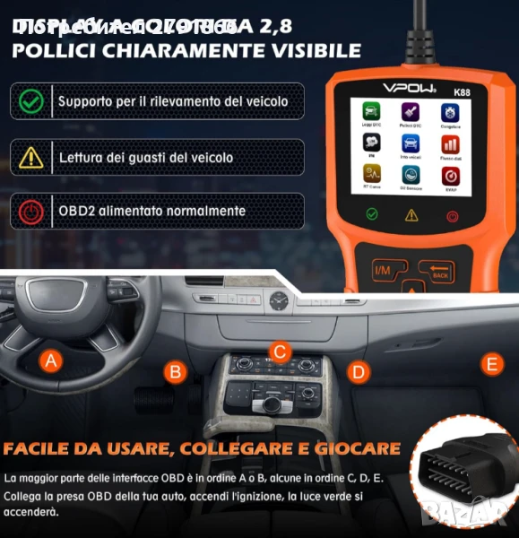 Цветен дисплей: Проектиран с 2,8-инчов цветен екран. Не е необходима батерия или зарядно устройство, OBD четецът се захранва директно от вашия автомобил чрез OBDII конектора за данни.