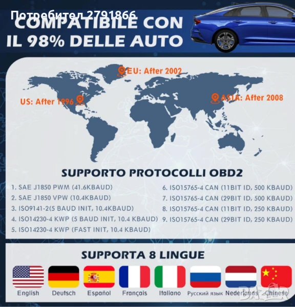 Широка съвместимост: Поддържа 9 протокола, съвместими с повечето автомобили, произведени в САЩ през 1996 г., автомобили, произведени в ЕС през 2000 г. и азиатски автомобили, както и с по-нови местни или вносни автомобили с OBD II и CAN. Поддържа 8 езика: английски, немски, италиански, холандски, френски, испански, китайски и руски. Осигурява точна и бърза диагностика за собственици на автомобили по целия свят.