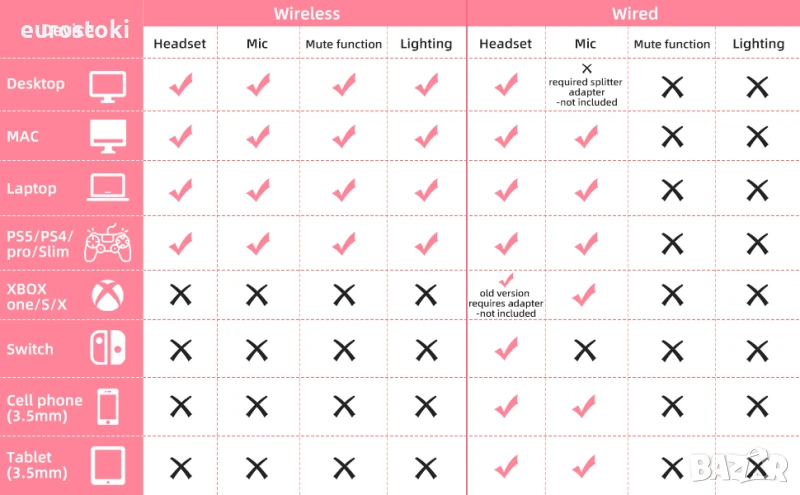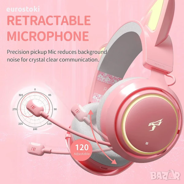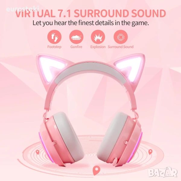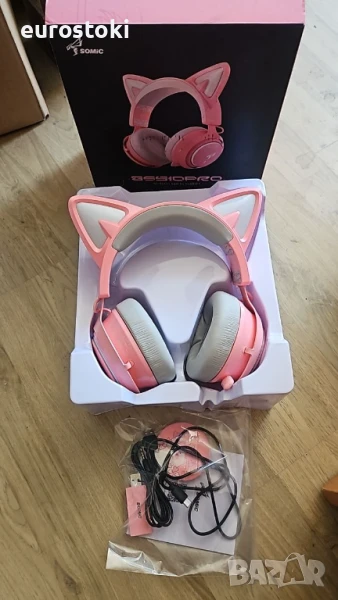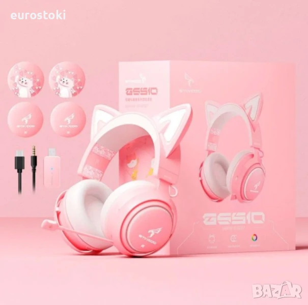 Безжични геймърски слушалки SOMIC GS510, 2.4G, стерео звук с регулируем микрофон, 3 звукови режима, RGB и контрол на силата на звука, PC, MAC, PS4, PS5, лаптоп, розови
