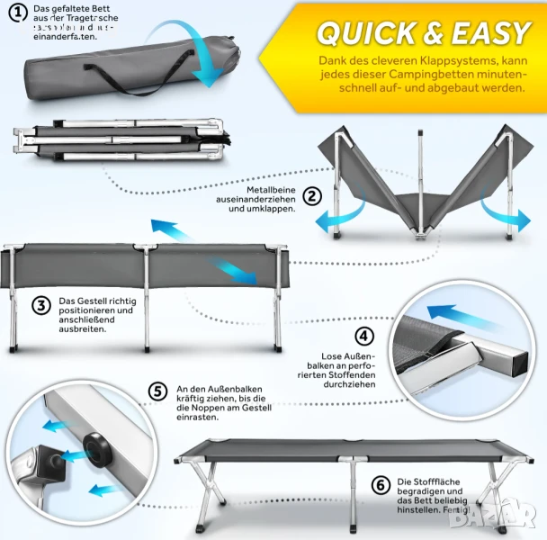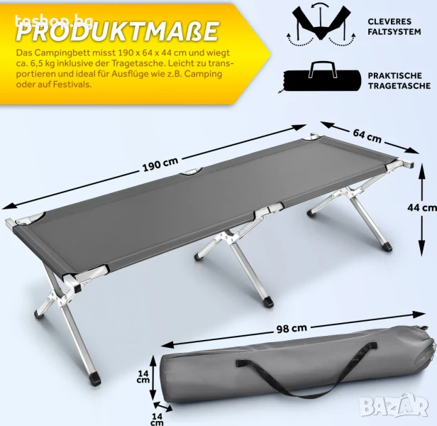 Къмпинг легло TRESKO XXL 190 x 64 x 44 см метална тръба - товароносимост до 150 кг