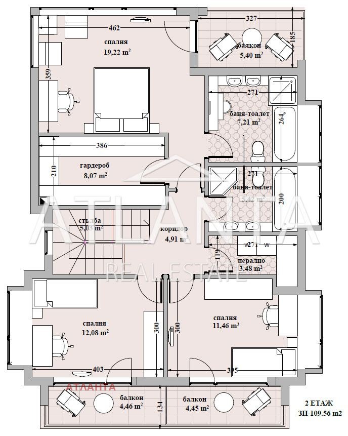 -3 Ниво (110 кв.м): две детски стаи, голяма панорамна тераса, пералня, коридор, баня и главна спалня с гардеробна и собствена баня + covered тераса, в коридора VELUX осветление