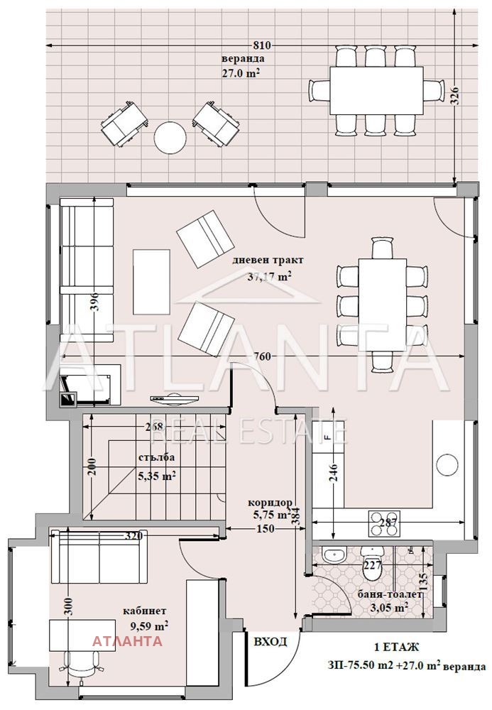 -2 Ниво (76 кв.м): входно антре, дневен тракт 38 кв.м с възможност за камина, кабинет/спалня, баня, веранда 27 кв.м и място за паркиране на 2 коли