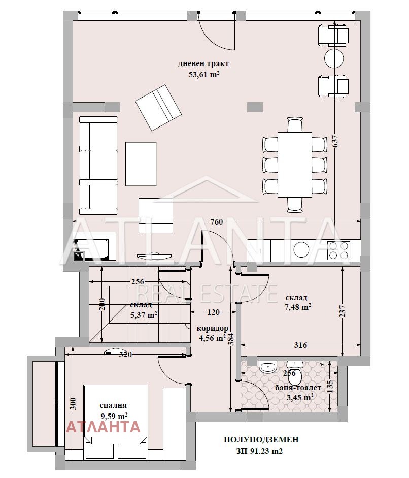 -Полуподземно / 1 Ниво (91 кв.м): дневен тракт 54 кв.м с излаз към двор, стая, подходяща за домакинство или с цел забавление - фитнес/домашно кино/билярд/механа/съхранение), спалня с английски двор, баня и машинно помещение