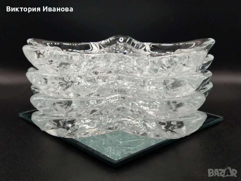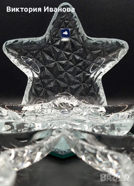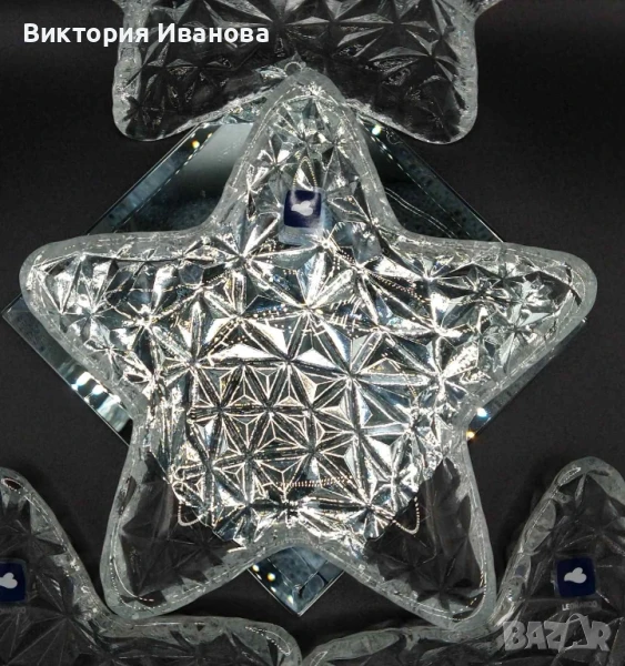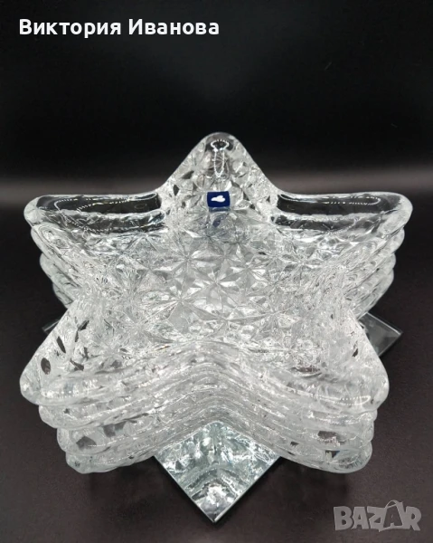 ​Ефектни стъклени купички от италианската марка Leonardo. Комплектът включва четири купички, Всяка от звездите е изработена от плътно стъкло с уникален релефен дизайн, който придава блясък и дълбочина. Идеален акцент за модерен интериор, подходящ за хол, спалня или коридор. В перфектно състояние, без никакви повреди,чисто нови кристални етикет.
