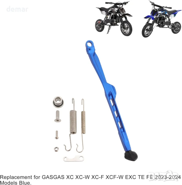 Здрава стойка за мотоциклет, проектирана за модели EXC, TE, TX и FE, както и за скутери и кросови мотоциклети, с дължина от 430 мм и разстояние между монтажните отвори от 18 мм за надеждна и дълготрайна употреба. Изработена от висококачествени материали за здравина и издръжливост, тя предлага семпъл дизайн, който е лесен за монтаж, подмяна и осигурява стабилно паркиране. Комплектът включва една странична стойка и бонус ключодържател.