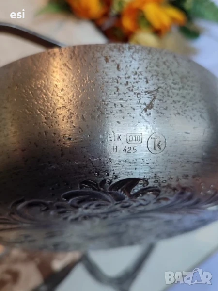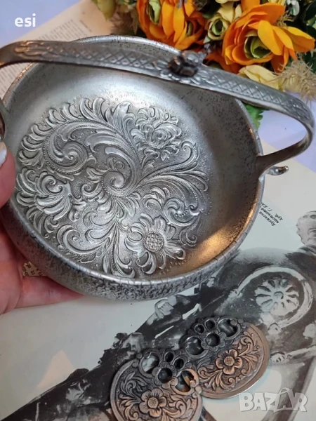 Малка купа с дръжка от норвежки калай EIK TINN, Година 1991 г. Норвежко металообработване, ръчно изкована калаена кошница с мотив на роза, скандинавска декорация С два декоративни медальона отстрани Ширина 16 см Височина 12 см Цена 80 лв