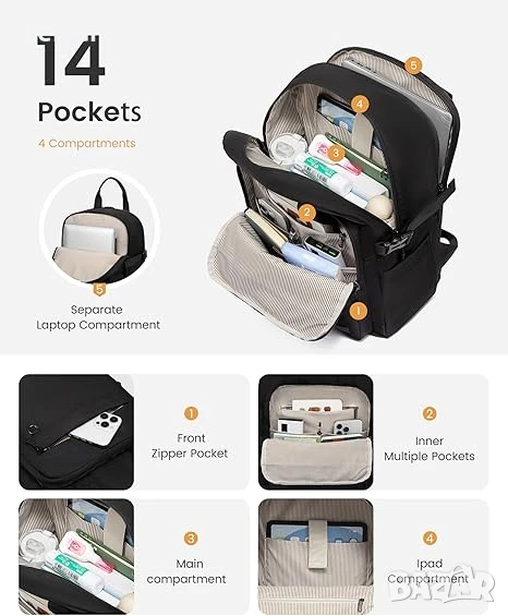 Тази раница предлага 14 добре разположени отделения за организирано съхранение на необходимите вещи за учене, работа или пътуване, включително подплатен джоб за лаптоп с бърз достъп, който побира устройства до 15,6" с допълнителна защита срещу удари и надрасквания. Изработена от водоустойчива, износоустойчива материя, тя осигурява издръжливост, като същевременно остава лека и удобна за носене. Проектирана за многофункционалност, тя включва заден джоб против кражба, презрамка за куфар за пътуване и модерен стил с цветни блокове, подходящ за кампус, пътуване до работа или ежедневна употреба, което я прави едновременно практична и подходяща за подарък.