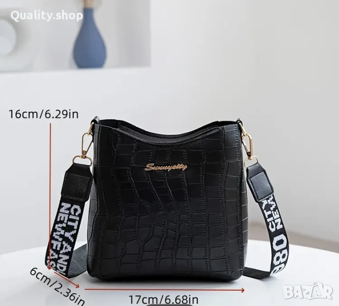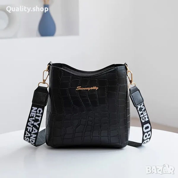 Стилна чанта през рамо с крокодилски мотив, златист обков и черна презрамка с букви. Универсална чанта за рамо от синтетична кожа в черно. Модерен минималистичен дизайн за ежедневна употреба.
