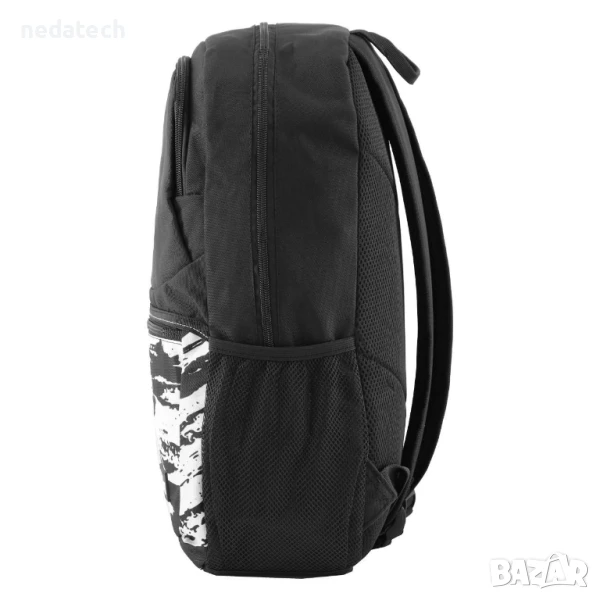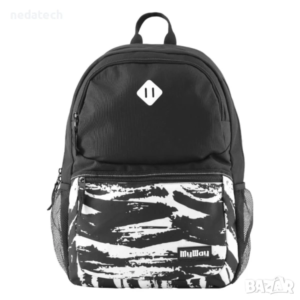 Ученичка раница, черна с дизайн „бяла вода“. Разполага с 1 голямо отделение, 1 по-малко отделение отпред в горната част, голям джоб и 2 мрежести джоба отстрани. Има мек гръб и регулируеми презрамки, пластмасови ципове и дръжка.