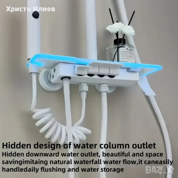 душ система с четири различни водни източника, осигуряващи максимално удобство и персонализирано изживяване. Светещият смесител добавя футуристичен ефект, създавайки уникална атмосфера по време на къпане.