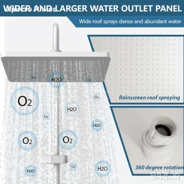 Голяма душ пита (душ тип "дъжд") с технология за водоспестяване без компромис в налягането. Въздушна система с омекотител против варовик, предотвратяваща запушване