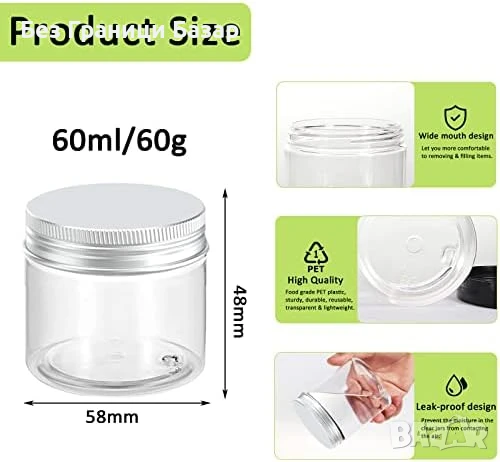 Нови 6 броя 60мл прозрачни бурканчета контейнери с алуминиеви капачки за крем, грим, проби, DIY