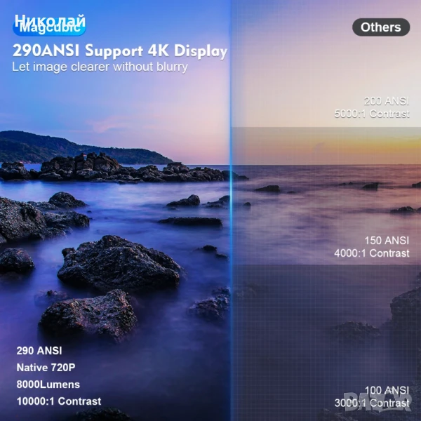 Насладете се на кристално чиста картина с поддръжка на 4K резолюция и нативна резолюция 1280x720P. Яркост от 290 ANSI лумена и живи цветове осигуряват завладяващи визуализации денем и нощем.