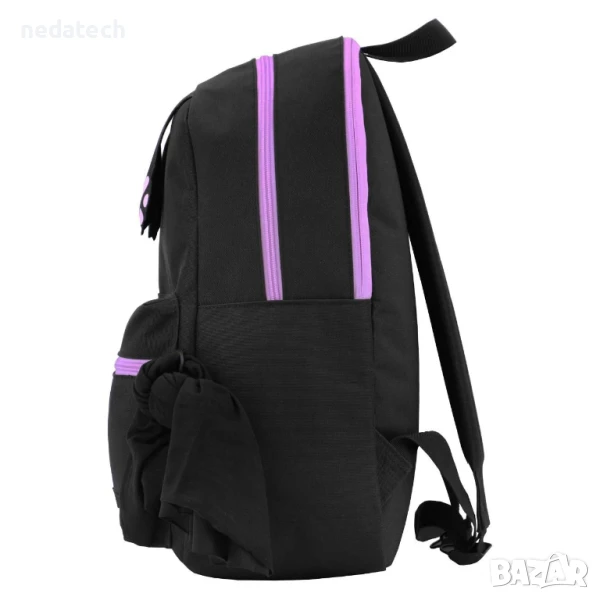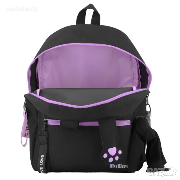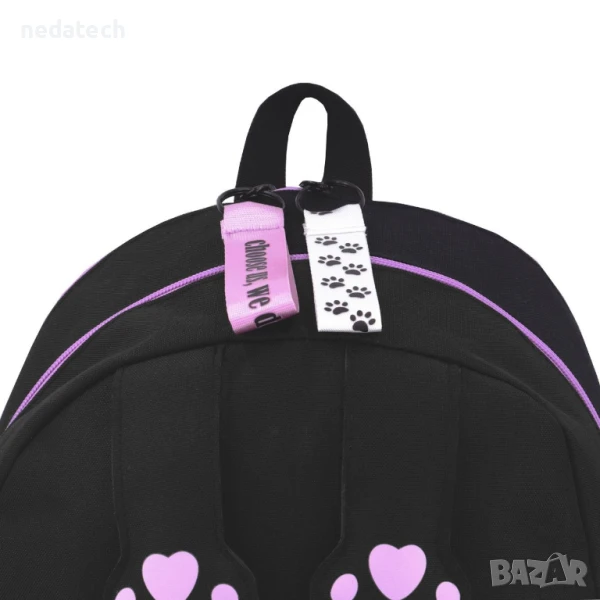 Ученическа раница в черно с черни крачета и лилави котешки лапи. Разполага с 1 голямо отделение с лилав цип, 1 лилав ключодържател с презрамка и надпис "Изберете ни, ние не ги притежаваме" и 1 бял с черни лапи и вътрешно отделение за лаптоп, 1 външен джоб с лилав цип и 2 ключодържателя с презрамка, единият бял с черни лапи, а другият лилав с надпис "Изберете ни, ние не ги притежаваме", и 1 малко външно отделение с лилав цип и черен ключодържател с презрамка и надпис "Любов" и многофункционална бандана в черно. Има мек гръб, дръжка и регулируеми презрамки.