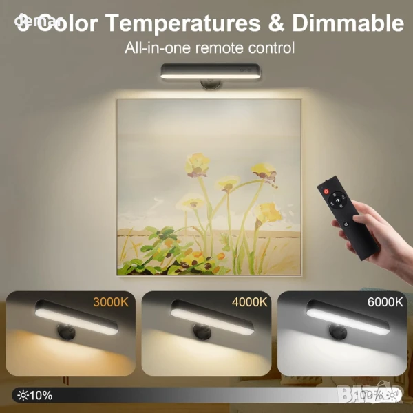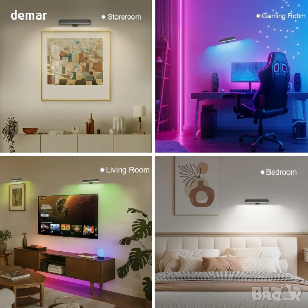 Тези акумулаторни стенни лампи разполагат с мощна батерия от 7500 mAh, която осигурява до 30 часа работа, с регулируема яркост и 3 цветни температури плюс 15 RGB опции за разнообразна атмосфера. Те осигуряват широкоъгълна, високояркостна, но мека и приятна за очите светлина, което ги прави подходящи за четене или общо осветление. Интелигентното дистанционно управление позволява лесно управление на режимите, димирането, таймерите и настройките за памет, а въртящата се на 360° глава предлага гъвкава посока на светлината. Монтажът е лесен с лепило или винтово закрепване, което ги прави практичен и стилен избор за спални и дневни.