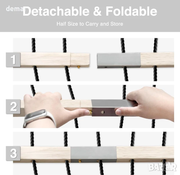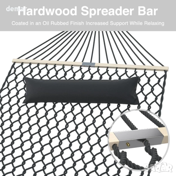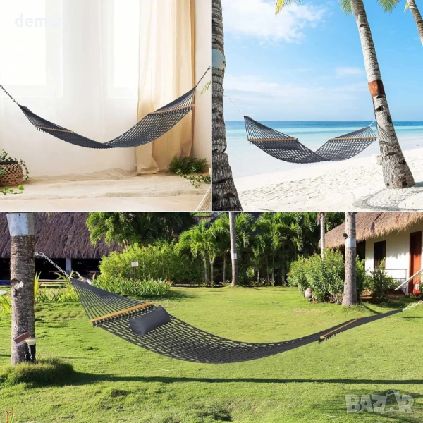 Този хамак е с двуслоен капитонен полиестерен дизайн с подвижна възглавница за допълнителен комфорт, дишаща ръчно тъкана мрежа, която насърчава въздушния поток, и изключително голям размер, проектиран да издържи до 150 кг за релакс самостоятелно или с други хора. Подходящ за употреба във вътрешни дворове, градини, задни дворове, край басейна или балкони, той осигурява удобно място за четене или дрямка. Дизайнът позволява лесно регулиране на опъването, за да се поддържа формата и да се предотврати провисване, което го прави издръжлив и универсален вариант както за почивка, така и за свободното време.