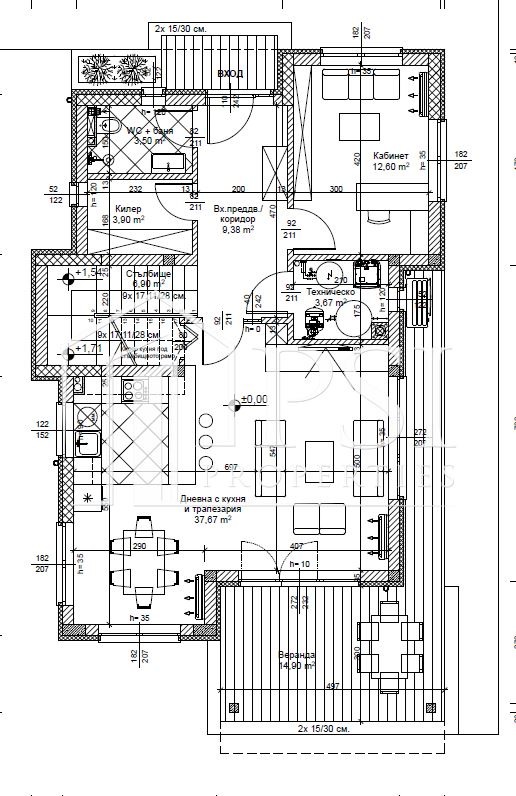 - Първи етаж: кабинет/спалня, баня с тоалетна, килер, техническо помещение, просторна дневна с кухня и трапезария, излаз към веранда. Под стълбите е обособен допълнителен килер към кухнята 🍽️