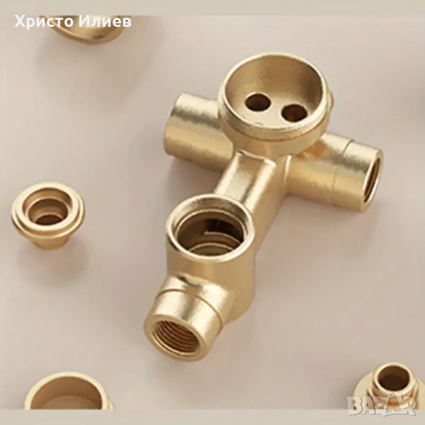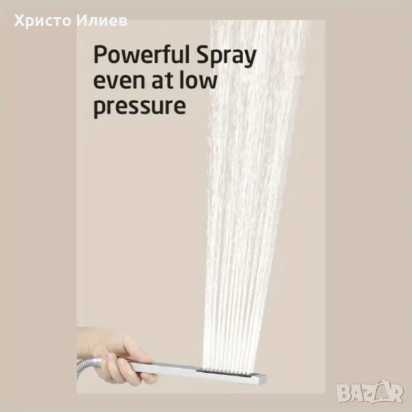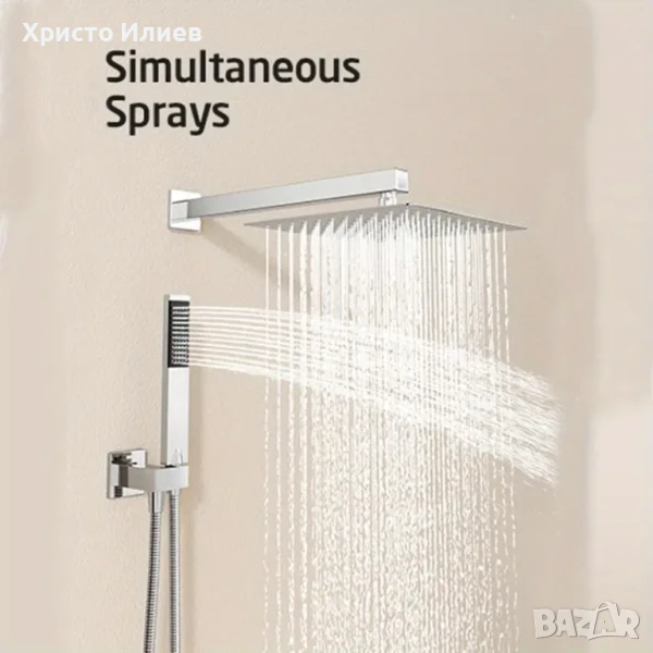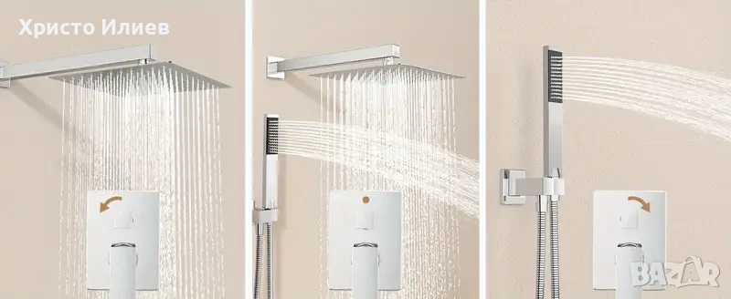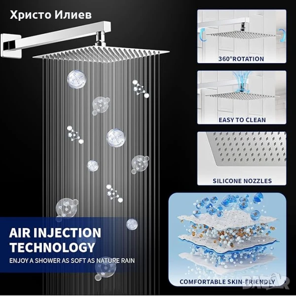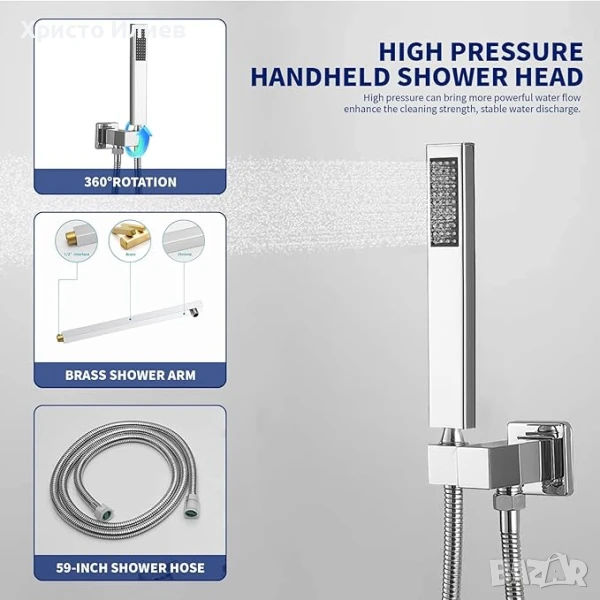 - Високо качество - Тялото на крана е изработено от здрав месинг, което гарантира високо качество и дълготрайност. Включва: квадратна душ глава тип „дъжд“ (неръждаема стомана 304), ръчна душ глава (месинг), рамо за душ (месинг), маркуч за душ (PVC), държач за душ (месинг), вентил за контрол на водата (месинг). 2-функционален превключвател, лесен за работа.