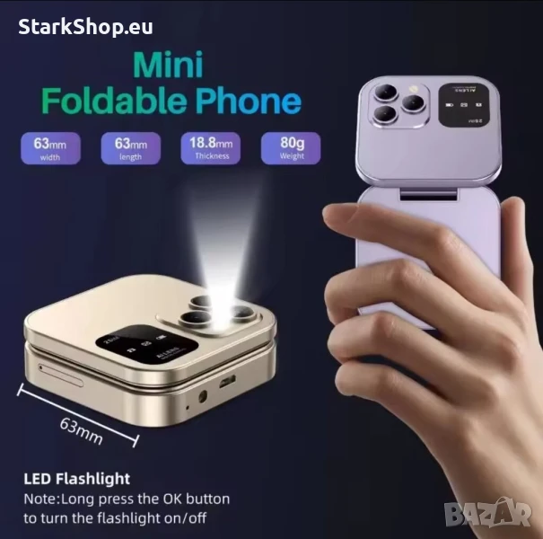 Сгъваем телефон: Компактен размер като пудра, когато е сгънат. Стилен и лесно се побира в джоба ви