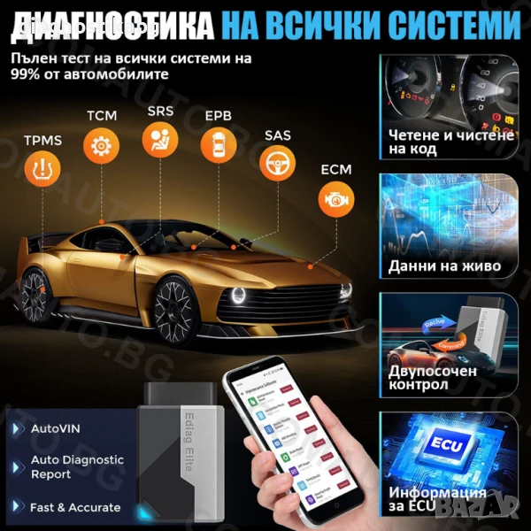 (НОВО 2025г.) Ediag Elite за пълна OBD2 диагностика с доживотен лиценз и 15 сервизни функции!