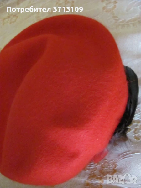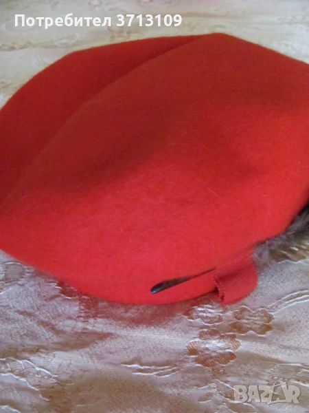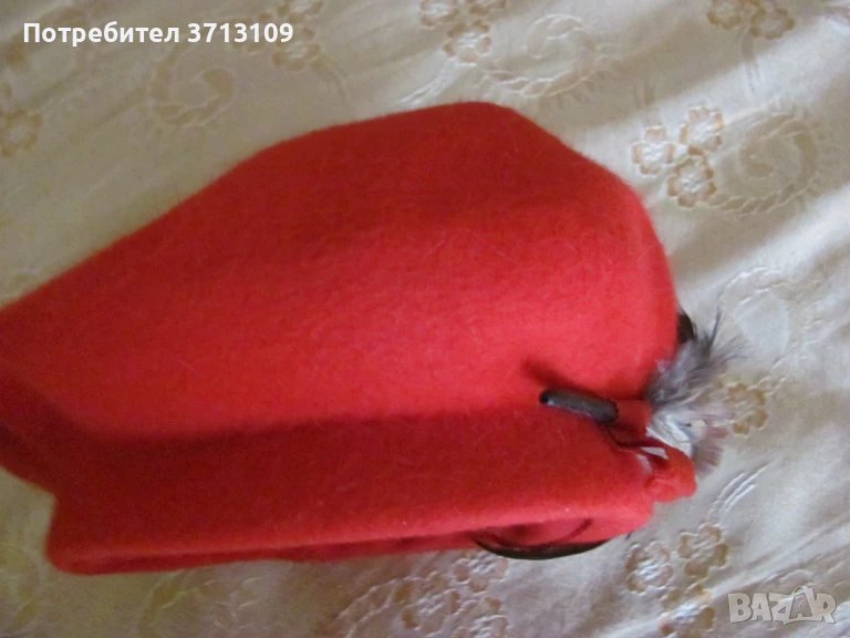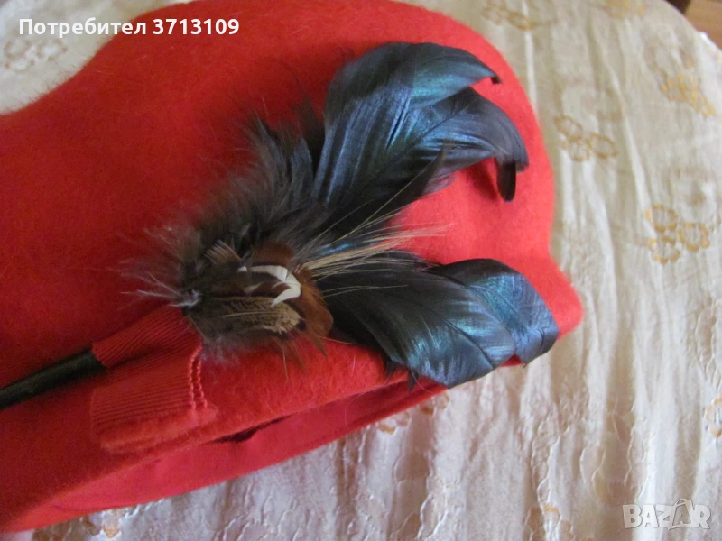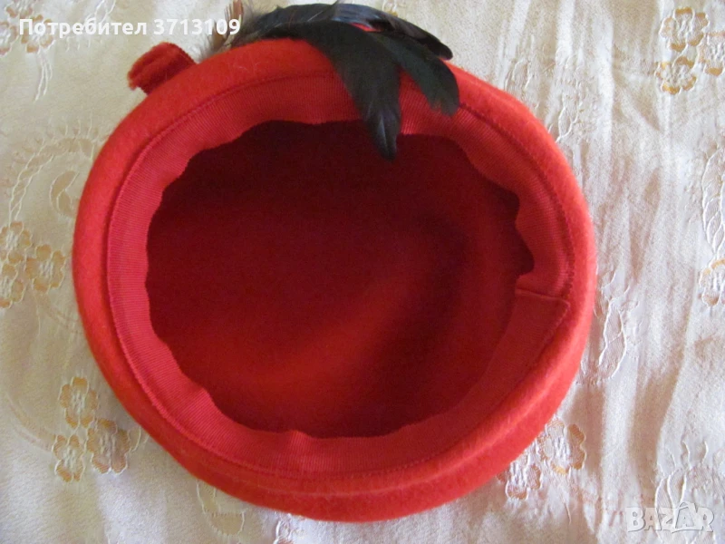 Красива червена дамска шапка барета -филц и пера