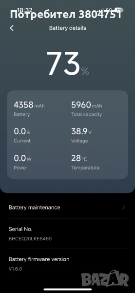 • Батерия: 5960 mAh (в момента на 73% е 4358 mAh – прилагам снимка)