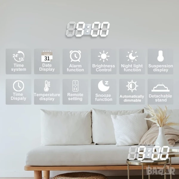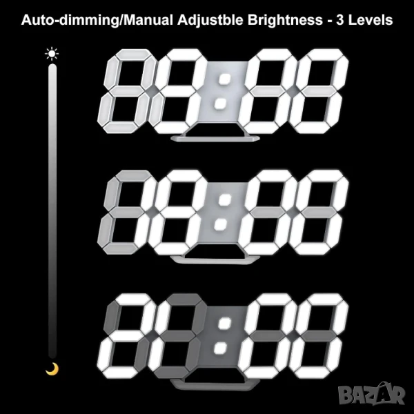 Многофункционален 25 сантиметров LED цифров часовник с 3D дизайн, подходящ за стенен или настолен монтаж. Моделът се отличава с технически характеристики, улесняващи употребата в дома, офиса, фитнес залата или чакалнята.