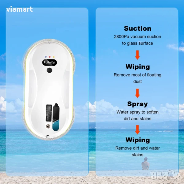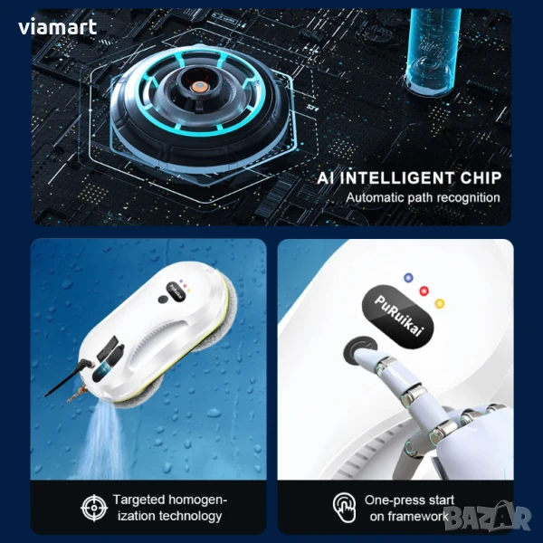 Робот за почистване на прозорци с автоматично пръскане PuRuiKai 309 - удобен уред, който спестява време и усилия при почистване на прозорци, огледала и гладки повърхности. Моделът е оборудван с AI навигация, ултразвуково пръскане и вградена UPS батерия, която го предпазва от падане при спиране на тока.