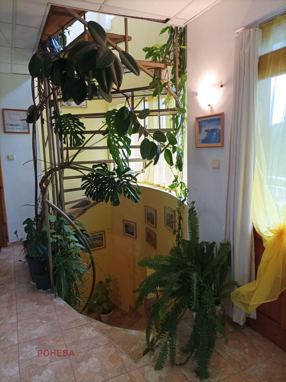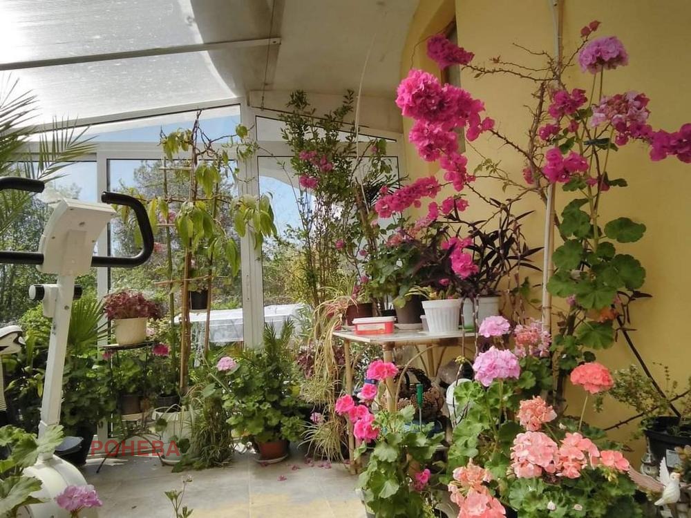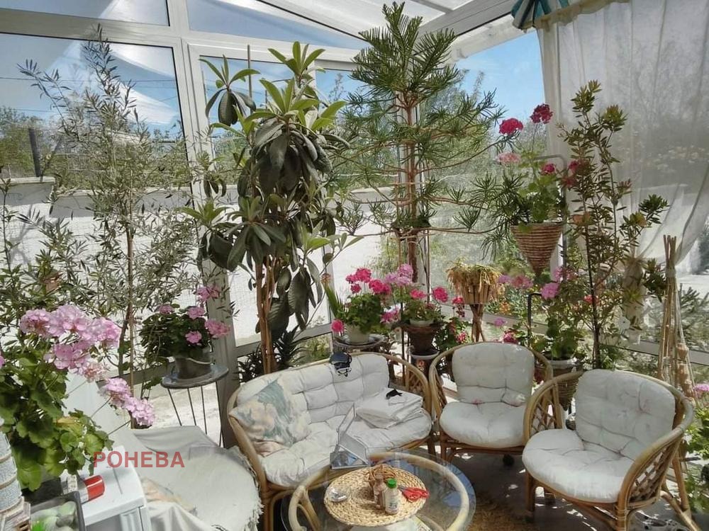 Имотът разполага с 9 стаи, като всяка е със санитарен възел; дневна с кухненски бокс 50 кв.м; втора малка кухня към едната стая и зимна градина. Избено и котелно помещение около 50кв. Поддържан и озеленен красив двор с барбекю зона и външна кухня, зад която се крие малка зеленчукова градина.