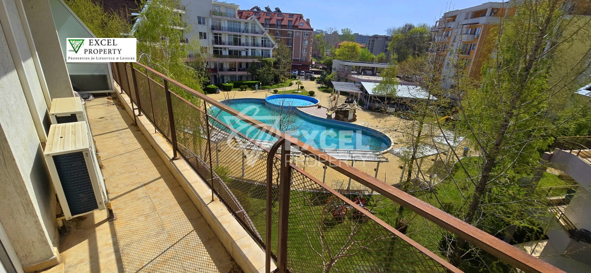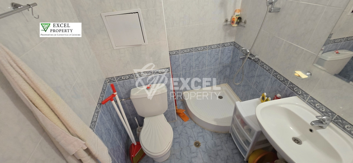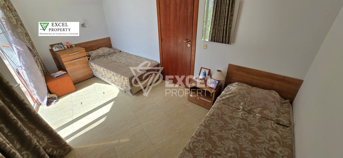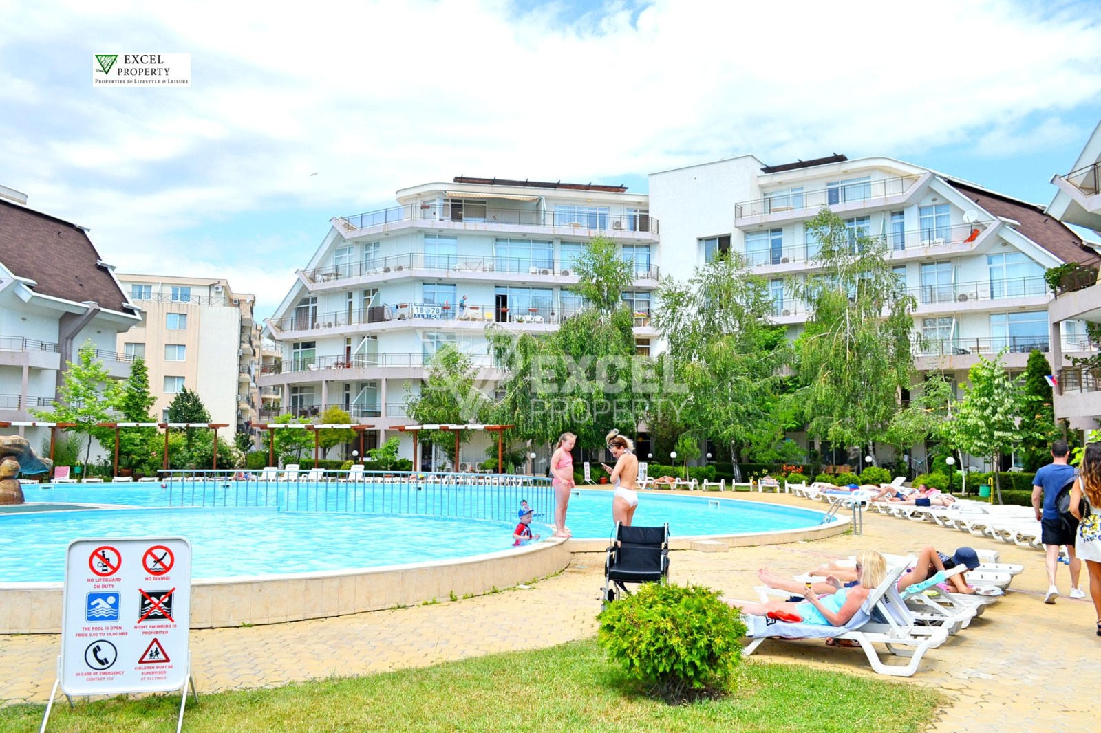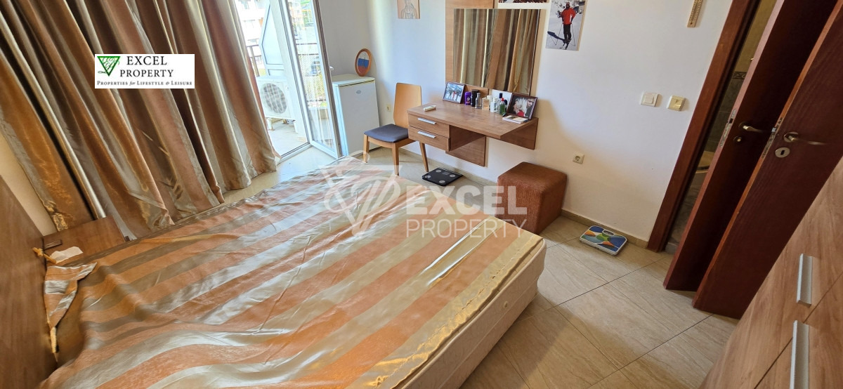 Тристаен апартамент за продажба в комплекс Сън Вилидж, Слънчев Бряг! Ексел Пропърти предлага за продажба тристаен апартамент за целогодишно ползване в Слънчев Бряг. Имота е светъл и слънчев, намира се в комплекс в центъра на курорта. Намира се на четвъртия етаж и е с обща площ от 85 кв.м. Предлага се напълно обзаведен входно антре, всекидневна с кухненски бокс, две спални, две бани и два балкона. Всекидневната разполага с разтегателен диван, масичка за кафе, маса за хранене с четири стола, и кухня с всички уреди като фурна, котлони, хладилник, пералня. Родителската спалня е оборудвана с двойно легло с нощни шкафчета, гардероб, тоалетка като към нея има балкон и собствена баня. Малката спалня е оборудвана с две отделни легла с нощни шкафчета и гардероб. Втория балкон е достъпен от всекидневната и малката спалня, като от него има гледка към басейна и югоизточно изложение. Сграда е предвидена за целогодишно ползване, разполага и с работещ асансьор. Комплексът е с АКТ 16 и разполага с басейна и зона за шезлонги и чадъри. Таксата поддръжка е 600 Евро на година.