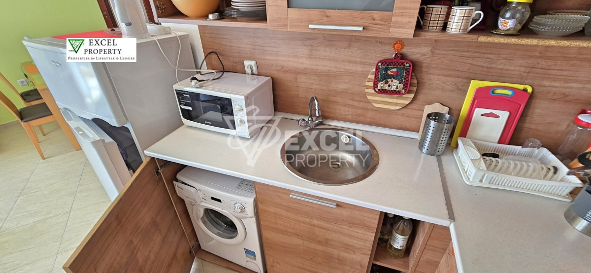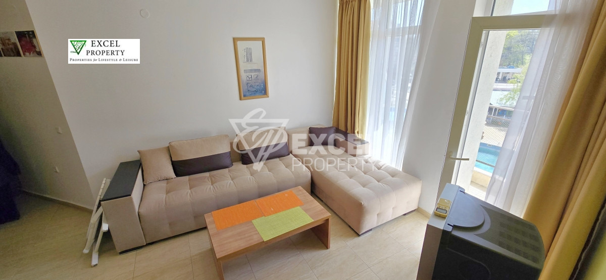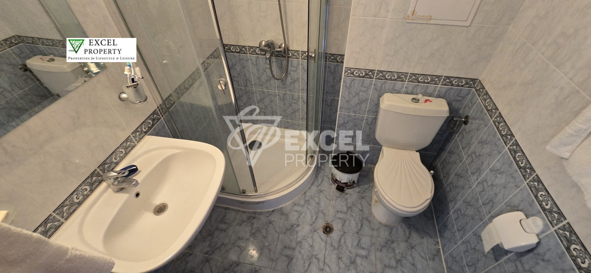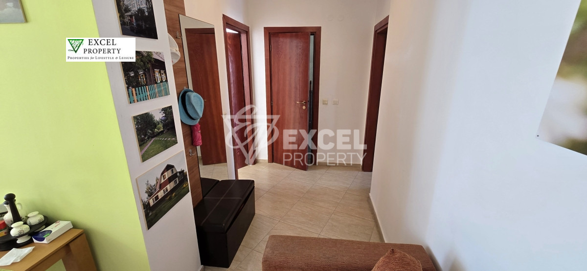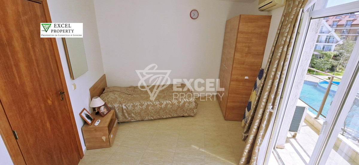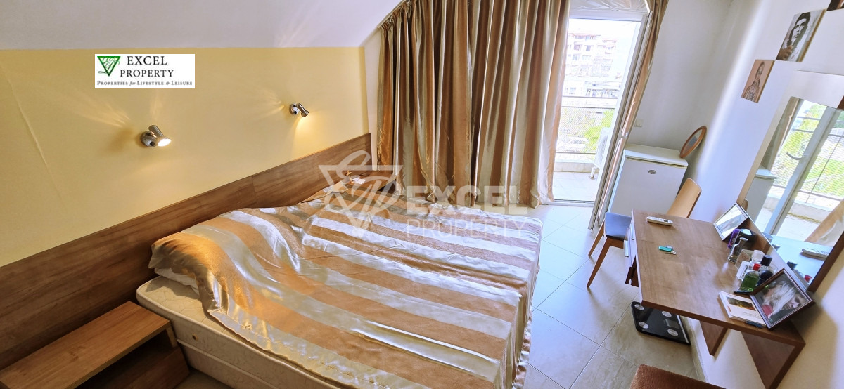 Тристаен апартамент за продажба в комплекс Сън Вилидж, Слънчев Бряг! Ексел Пропърти предлага за продажба тристаен апартамент за целогодишно ползване в Слънчев Бряг. Имота е светъл и слънчев, намира се в комплекс в центъра на курорта. Намира се на четвъртия етаж и е с обща площ от 85 кв.м. Предлага се напълно обзаведен входно антре, всекидневна с кухненски бокс, две спални, две бани и два балкона. Всекидневната разполага с разтегателен диван, масичка за кафе, маса за хранене с четири стола, и кухня с всички уреди като фурна, котлони, хладилник, пералня. Родителската спалня е оборудвана с двойно легло с нощни шкафчета, гардероб, тоалетка като към нея има балкон и собствена баня. Малката спалня е оборудвана с две отделни легла с нощни шкафчета и гардероб. Втория балкон е достъпен от всекидневната и малката спалня, като от него има гледка към басейна и югоизточно изложение. Сграда е предвидена за целогодишно ползване, разполага и с работещ асансьор. Комплексът е с АКТ 16 и разполага с басейна и зона за шезлонги и чадъри. Таксата поддръжка е 600 Евро на година.
