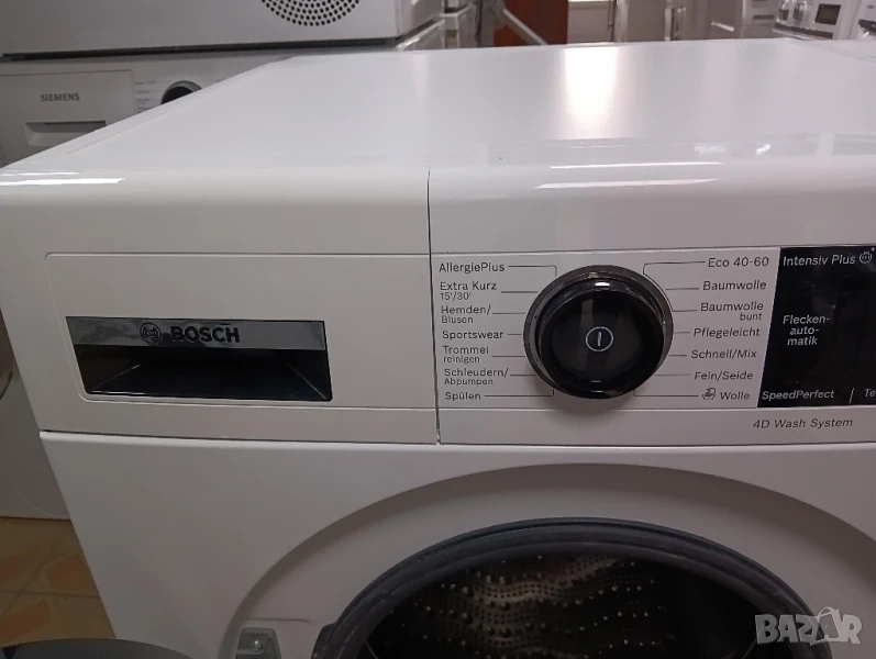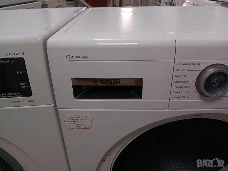 Чудесна сушилна с термопомпа Бош серия 8 с лед дисплей, отложен старт, изцяло тъчскрийн управление на бутоните, инверторен мотор, инверторен компресор, функция гладене при която дрехите излизат от сушилнята без гънки, автоматично почистване и др.