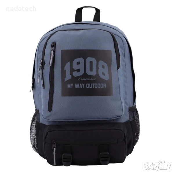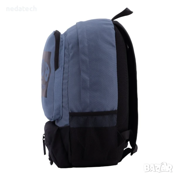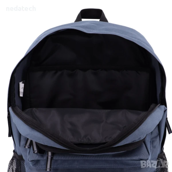 Ученическа раница в синьо с черно дъно. Разполага с 1 голямо отделение с вътрешно отделение за лаптоп, 1 малко отделение с органайзер, 1 преден джоб, 1 отделение в долната част и 2 мрежести отделения отстрани. Има мек гръб с регулируеми презрамки, допълнителни презрамки в долната част за носене на постелка за упражнения и дръжка.