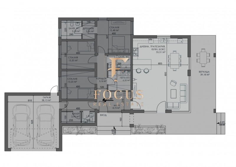 Къщата е с обща квадратура 245,10 кв.м. като има следното разпределение: антре, дневна с кухненски бокс, три спални, дрешник, две бани с тоалетни, отделна тоалетна, мокро помещение, килер, веранда и голям гараж с топла връзка
